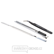 Sada nářadí a přípravků v plastovém kufříku obsahuje precizní šroubovák, 30 vyměnitelných bitů (H4 x 28 mm), prodlužovací nástavec, pinzetu, odlamovací nůž a řadu přípravků pro servis mobilů, tabletů a další elektroniky.