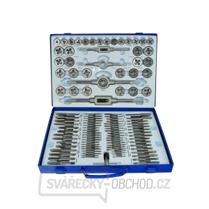 110-dílná sada metrických závitníků a závitových oček ze standardní nástrojové oceli pro ruční závitování pomocí vratidla.