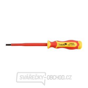 Profesionální izolovaný plochý šroubovák VDE 5,5x125 mm určený pro elektrikáře. Ergonomická vícesložková rukojeť zajišťuje účinnou izolaci až do 1000 V. Ideální pro všechny druhy prací na instalacích nízkého napětí. Čepel šroubováku je vyrobena z vysoce kvalitní oceli S2, která byla pro optimální výkon podrobena vhodné tepelné úpravě, tvrdost čepele se pohybuje mezi 56-60 HRC. Dřík šroubováku je naproti tomu vyroben z oceli CRV, která se vyznačuje vyšší pružností.