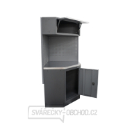 Závěsná skříňka: Závěsná rohová skříňka a víceúčelová děrovaná závěsná deska s lištami, poskytují praktický úložný prostor a efektivní organizaci nářadí a pracovních pomůcek na stěně.