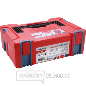 Plastový box velikosti M. Možnost pevného spojení více boxů dohromady pomocí posuvných zámků, box velikosti L umožňuje přimontování koleček, díky kterým je mobilní, což je výhodou zejména v okamžiku spojení více boxů.