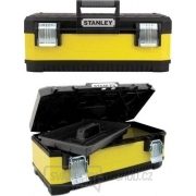 Pevný a odolný kovový profesionální box s plastovými doplňky Stanley ve žluté barvě. Přednostmi jsou ergonomická bimateriální rukojeť a kovové nerezové přezky s očky pro uzamčení boxu visacím zámkem. "V" žlábek ve víku pro založení latí, trubek apod. při řezání. Vyjímatelná přihrádka na drobné nářadí.