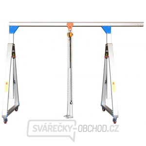 Pojízdný portálový jeřáb z aluminiové slitiny o nosnosti 1000 kg je výškově i šířkově nastavitelný a vybavený kladkostrojem s ručním zdvihem pomocí ovládacího řetězu. Jeřáb má výšková nastavení pomocí klikového mechanismu v rozsahu 2500 až 4000 mm, možnost nastavení šířky jeřábu ve dvou polohách: 3000 mm a 4000 mm.