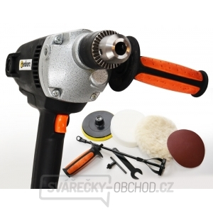 Praktický víceúčelový elektrický přístroj typu 5 in 1 je koncipován tak, aby pracoval jako vrtačka, bruska, leštička (houba a vlněný návlek) a míchadlo barev, lepidel, stavebních hmot atd.