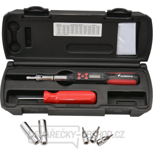1ks digitální momentový klíč, 1/4", rozsah: 0,6-12 Nm, rozlišení: 0,01 Nm, přesnost ± 3 %, paměť pro 50 záznamů/údajů, bzučák a LED-indikátor pro 9 přednastavených momentů, automatické vypínání po 5 minutách bez použití, volitelně podržení aktuální hodnoty (Peak/Hold) nebo režim sledování (Track Mode), dl. 233 mm