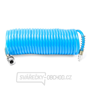 Spirálová hadice pro připojování pneumatického nářadí z vysoce odolného materiálu ve velikosti 9,5x6,5 mm/délka 7,6 m má na obou koncích rychlospojkové koncovky (German Type), barva modrá.