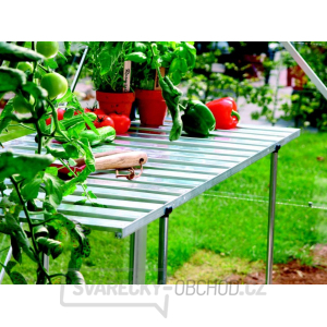 Hliníková AL polička ukotvená dvěmi panty na stěně a podepřená dvěmi podpěrami od podlahy. Vhodné pro skleníky řady VITAVIA CALYPSO, VITAVIA VENUS, VITAVIA TARGET, VITAVIA URANUS. Dodáváme v rozebraném stavu jako stavebnici.