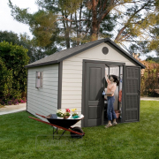 Plastový zahradní domek, š 336 x d 336 x v 285 cm, zastavěná plocha 11,29 m2. Výrobce - LIFETIME PRODUCTS INC., Clearfield, Utah, USA. Plastový zahradní domek "nové generace" k uskladnění zahrádkářských, sportovních, bazénových, grilovacích, campingových, motoristických a dalších potřeb. Moderní design, snadná montáž, celoroční použití. Zahradní domek má nosnou kovovou konstrukci a dvojité stěny, střecha, dvojité dveře, podlaha jsou vyrobeny z masivního velmi odolného a prakticky nerozbitného plastu. Plastová protiskluzová podlaha je součástí domku (je v ceně).